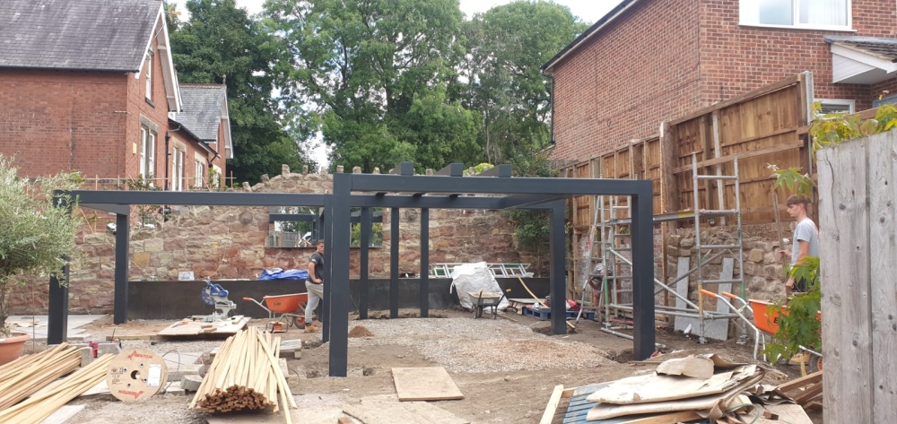 This pergola was made from 200mm x 200mm box section and powder coated in matt grey to colour match the water feature. Steel is a great alternative to wood, it requires no maintenance and can be powder coated in a variety of colours to fit perfectly into your colour scheme.